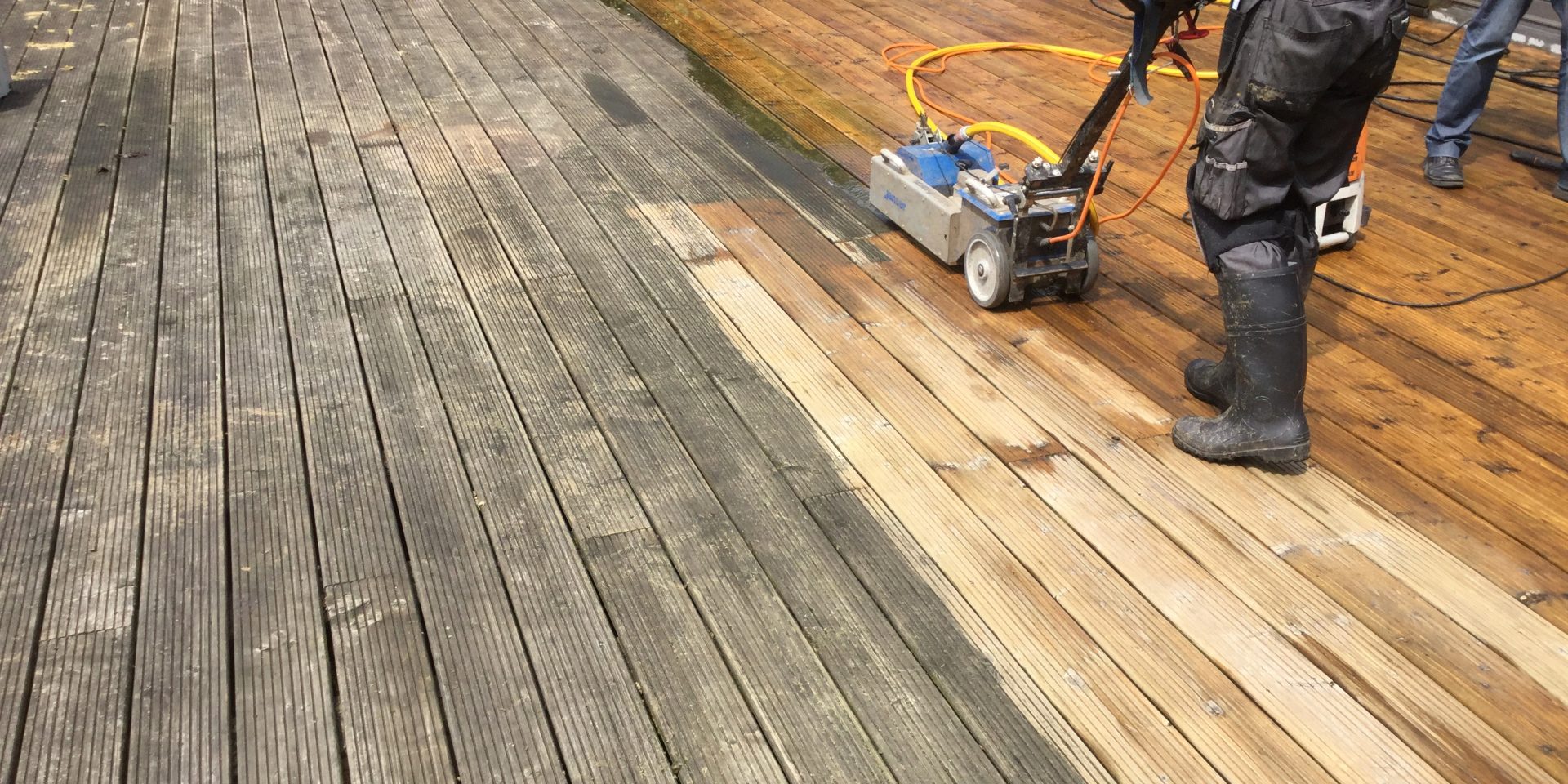 Pour les planches striées, on utilise des brosses adaptées. Un agent dégrisant à base d’acide oxalique peut être utilisé. La coloration grise uniforme fait rapidement son apparition après le traitement donnant un joli aspect au bois. L’important est d’éliminer les mousses responsables de l’état glissant et dangereux des planches par temps de pluie.